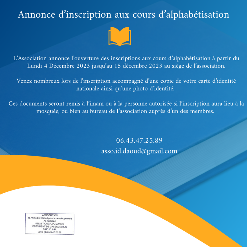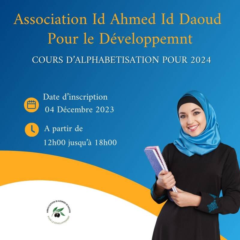 L’Association annonce l’ouverture des inscriptions aux cours d’alphabétisation à partir du Lundi 04 Décembre 2023 jusqu’au 15 décembre 2023 au siège de l’association de 12h00 à 18h00.